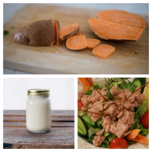 4.) A lecsöpögtetett tonhalat villával pépesítjük, és osszuk el az édesburgonyák tetején között.